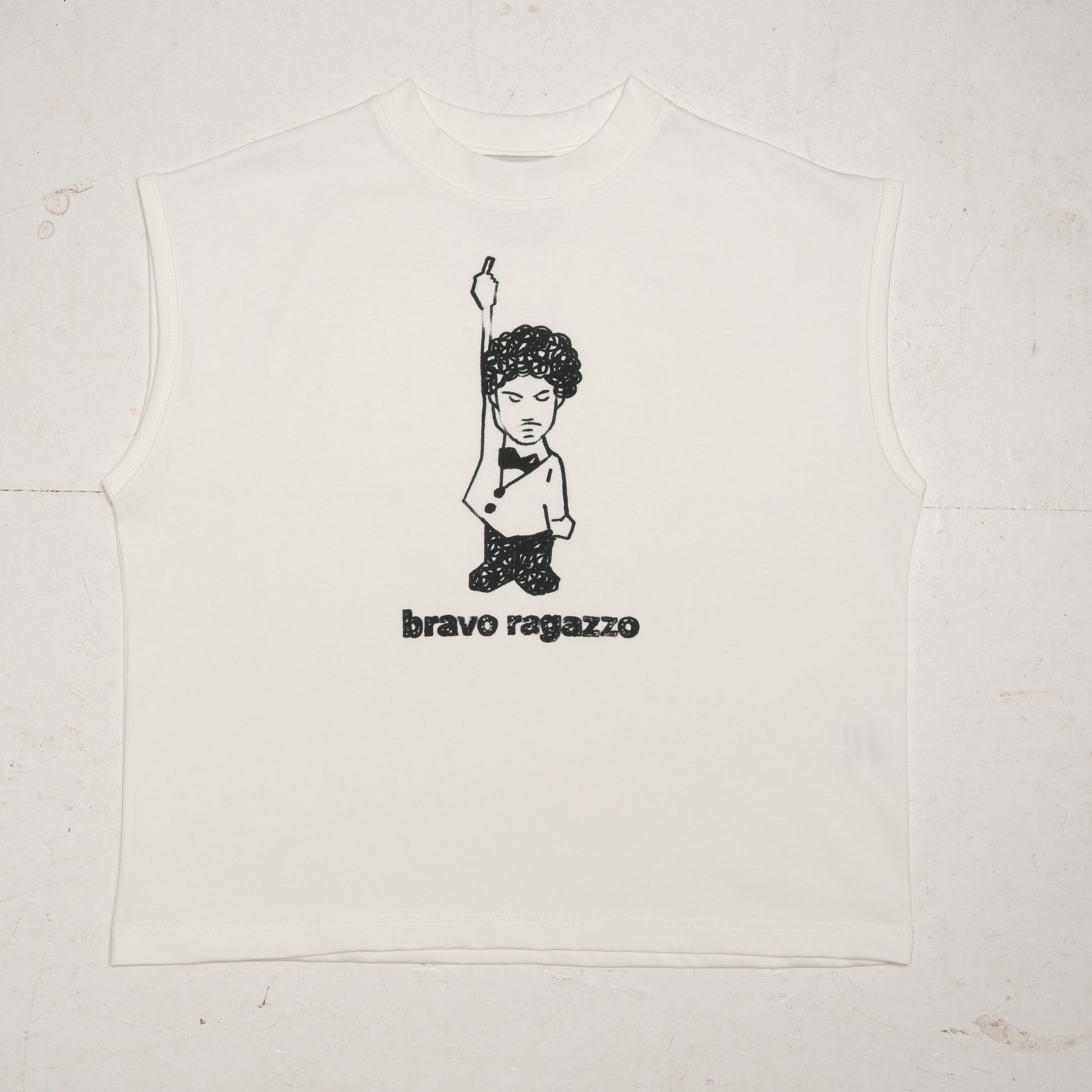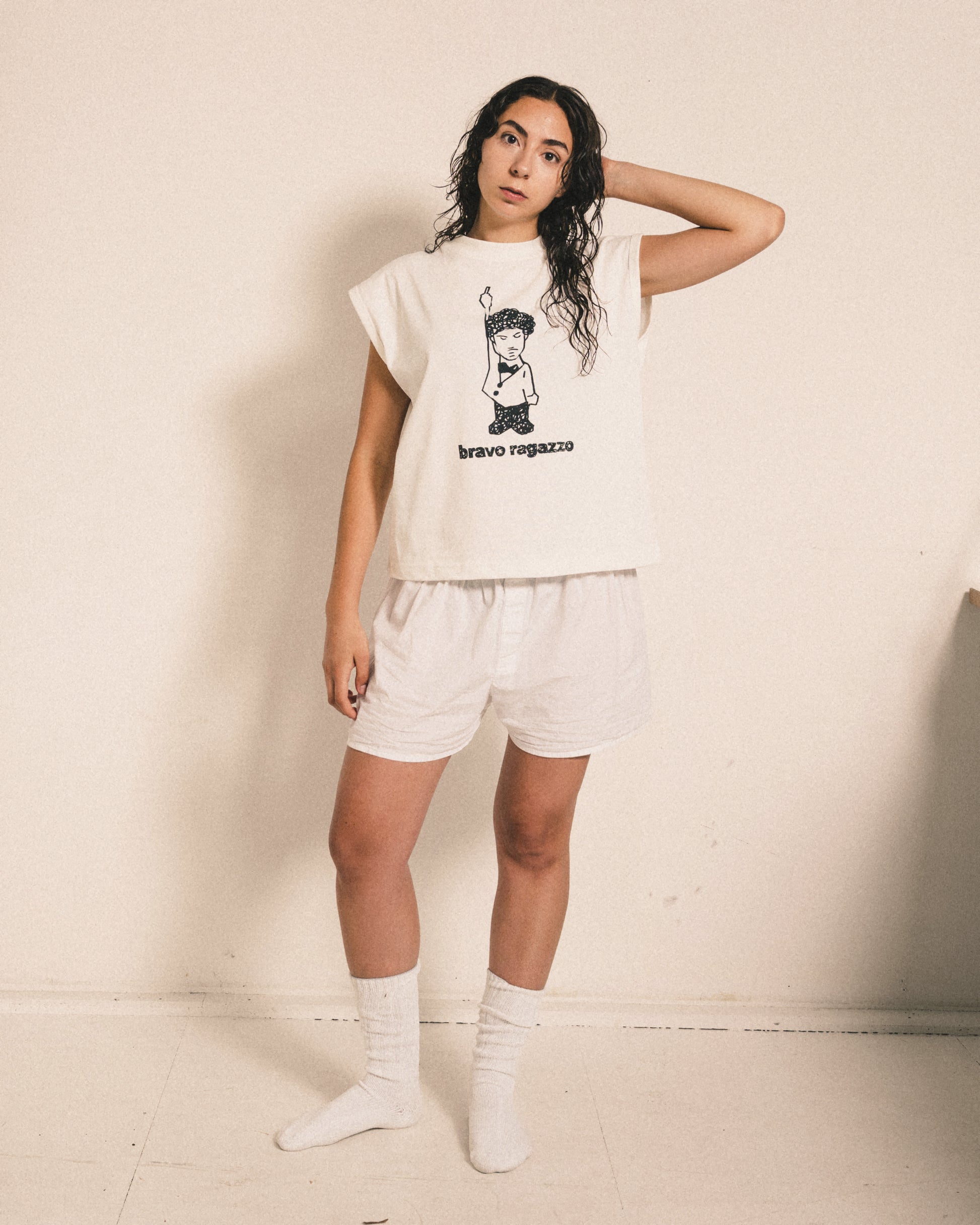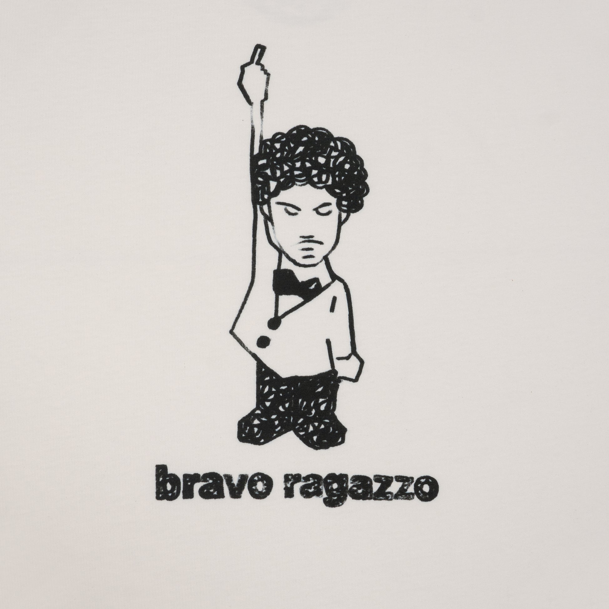 Crafted in natural off-white with a bold, graphic front – the iconic bravo ragazzo print – and a subtle logo detail at the back neck.